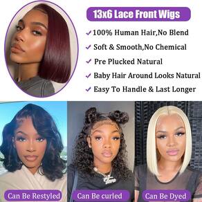 -?Perucas frontais Bob Lace 99j Cabelo humano?: peruca frontal de renda transparente HD 13X6, muito macia e invisível. Combina perfeitamente com sua pele. Linha de cabelo natural pré-arrancada com cabelo de bebê faz com que pareça mais natural. O efeito de desgaste é o mesmo do seu próprio cabelo natural. Isso lhe trará uma aparência perfeita para sua vida diária, encontros e festas temáticas, e o tornará mais confiante e charmoso.
