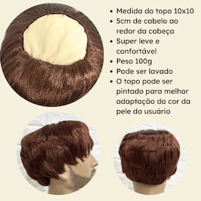 - Fibra kanekalon pet; - 5cm de comprimento dos fios; - Modelo Wig com topo em panol; - Temperatura máxima aceita 130º ; - Tamanho da peruca M (Produto flexível); - 100 gramas em média;