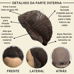 - Fibra orgânica especial; - Modelo front Lace HD; - 65cm de comprimento; - Aceita chapinha até 180º; - Possui três pentes internos para maior fixação; - Peso do produto 280gm em média; - Tamanho da peruca M (padrão) com alças internas ajustáveis.