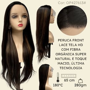 - Fibra orgânica especial; - Modelo front Lace HD; - 65cm de comprimento; - Aceita chapinha até 180º; - Possui três pentes internos para maior fixação; - Peso do produto 280gm em média; - Tamanho da peruca M (padrão) com alças internas ajustáveis.