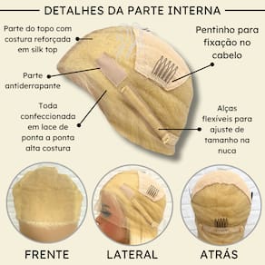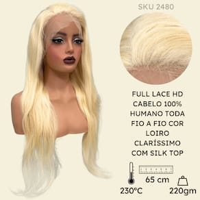 - Cabelo 100% humano processado (Sem fios sintéticos); - Full Lace (Lace em toda a cabeça); - Cabelo liso ondulado (Após lavagens é possível que surjam mais ondulações); - Silk top na região superior com maior reforço na costura; - 65 centímetros de comprimento; - Densidade em 180%; - Alças internas para regulagem de tamanho na cabeça; - Com suportes laterais antiderrapantes; - Possui quatro pentes internos para maior fixação; - Tamanho da peruca M (Adapta-se bem a maioria dos tamanhos de cabeça); - 220 gramas em média. Marca: LIONSWIG