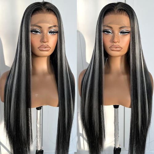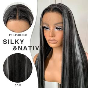Peruca MITIMES Highlights Peruca de renda HD reta sem cola em preto e branco Destaque Peruca frontal de renda Yaki pré-arrancada cinza sintética Yaki de 32 polegadas - reaproveitada várias vezes: é uma fibra resistente ao calor de alta qualidade “Take Heat Well”, brilhante e saudável para cabelo humano, macia e fofa - a peruca longa e reta é adequada para qualquer formato de rosto, toda mulher deve ter uma peruca frontal de renda como esta, natural preto, gengibre, rosa, azul escuro, marrom, adequado para muitas peles. Mostre sua beleza ao máximo. - Dá couro cabeludo: parece que está crescendo a partir do couro cabeludo. A renda transparente HD a torna mais estável e com aparência mais natural ao usar. Basta cortar a renda para obter. Peruca frontal de renda sintética pré-arrancada na linha do cabelo natural - Adequada para iniciantes, use uma peruca pré-cortada com renda HD sem cola, economizando mais tempo. - Serviço perfeito: Temos uma equipe de pós-venda, se você tiver alguma insatisfação, sinta-se à vontade para entrar em contato conosco e faremos o possível para resolver suas necessidades.