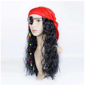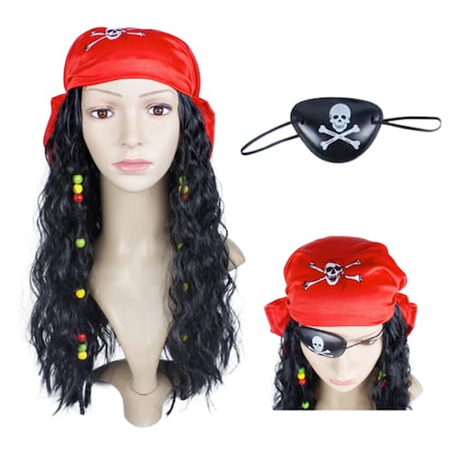 - Na compra receberá o kit com peruca com miçangas, tapa-olho e bandana.