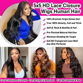 - Perucas de cabelo humano com fecho de renda HD 5 x 5 Material: Perucas de cabelo humano virgem brasileiro 100% não processadas de grau 10A para mulheres negras, peruca ondulada corporal de densidade 180, cortada diretamente da cabeça feminina jovem e saudável. Espessa, natural e saudável, completa e saudável, macia e confortável contra a pele.