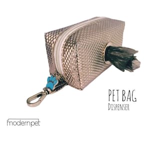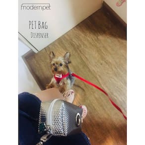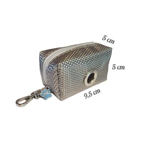 Pet Bag Dispenser além de prático e fácil de levar nos passeios do seu amigão, possui um design elegante com tecido metalizado e mosquetão para prender na guia, bolsa ou cinto.