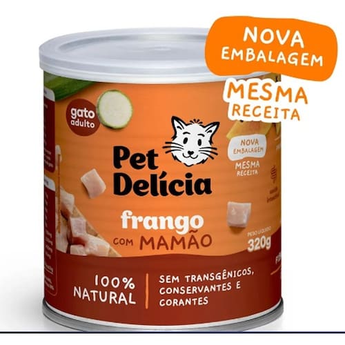 Ração Umida Natural Pet Delicia Lata Gatos Frango Com Mamao - 320 g - Indicada para gatos adultos; - Alimentação natural e balanceada; - Cortes nobres de frango (mono proteica), frutas e legumes frescos; - 0% conservantes, transgênicos, corantes, sabores artificiais, e subprodutos; - Método de cozimento delicado para conservar os nutrientes naturais; - Contem carboidratos de baixa índice glicêmica; - Rica em ômegas 3 e 6 para uma pele saudável e pelos com brilho; - Rica em fibras naturais, prebióticos e beta-glucanos para auxiliar saúde intestinal; - Papaína, micronutriente presente no mamão, evita bolas de pelo; - Sódio controlado; - Umidade ideal; - Baixo teor de carboidratos; - Alta digestibilidade; - Cheirosa e saborosa; - Desenvolvida por especialistas e atende as recomendações do NRC 2006 e AAFCO 2014;