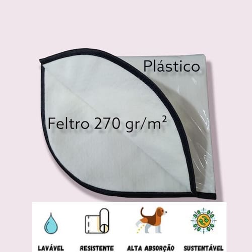 =============================================== Especificação do produto: Fabricação própria, fabricado com duas camadas. A primeira com alta absorção composição: feltro 270 Gr/m, aproximadamente 4 mm de espessura ; A segunda impermeável para retenção da urina, impedindo que vaze para o chão. composição: plástico maleável de 0,10 mm , com borda viés preto de 22 mm. Produto ecológico e bem mais econômico do que os descartáveis e absorve mais. Parte superior própria para alta absorção. Fácil de usar, apenas passar na água corrente e colocar pra secar. Para os pets macho, orientamos a colocar um cone no centro do tapete. Pode ser utilizado no interior do sanitário canino, não inala odor. Garantimos a qualidade do produto.