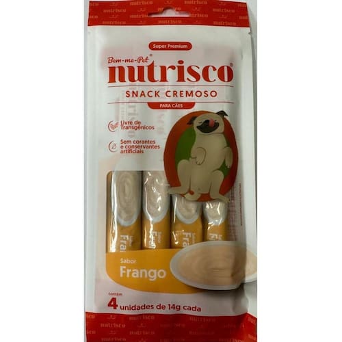Ficha Técnica:Marca: Nutrisco Nome: petisco Cremoso Nutrisco Indicação: Cães Sabor: Frango Apresentação: pacote com 04 unidades de 14g cada