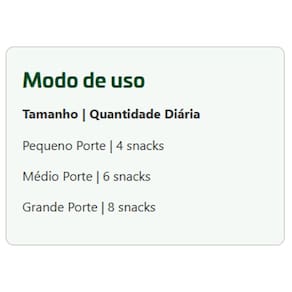 Dicas de Uso:Ofereça o petisco como recompensa para bom comportamento ou durante sessões de treinamento. Não exceda a quantidade recomendada para evitar excesso de calorias na dieta do seu cão. Mantenha a embalagem bem fechada em local seco e fresco, longe da luz solar direta, para preservar a qualidade do produto. Sempre deixe água fresca e limpa à disposição do seu pet.
