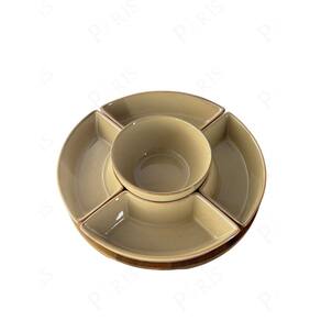 Cód: UN0012 Petisqueira de Madeira com 5 Bowls de Cerâmica Bege Material: Madeira e Cerâmica Cor: Bege Dimensões Petisqueira: Ø30x1,5cm Dimensões Bowls: 1 Bowl: Ø14x6cm 4 Bowls: 20x8x4cm (CxLxA)