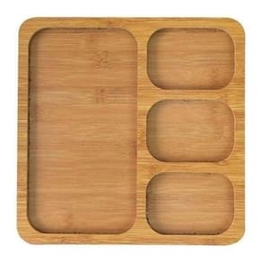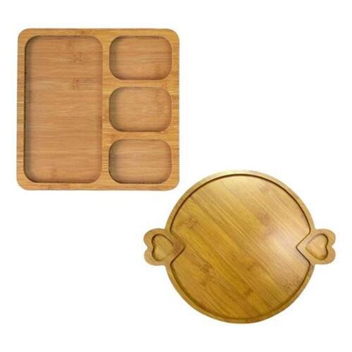 Especificações técnicas: - Material: Gamela de bambu, Petisqueira tábua de frios de madeira MDF - Cor: Marrom - Dimensões Gamela de bambu: Diâmetro 30 cm, altura 1.3 cm, largura 30 cm - Dimensões Petisqueira tábua de frios: 30 cm de comprimento, 30 cm de largura, 1 cm de altura - Design redondo com divisórias na gamela de bambu - Design quadrado com 4 divisórias na petisqueira tábua de frios