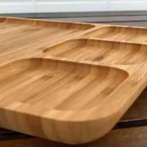 Petisqueira de MDF Laminado com aparência de Bambu com 4 divisórias em formato de Corações. Ideal para servir diversos tipos de petiscos, perfeito para ir à mesa em seus Jantares, reuniões, festas e ocasiões especiais.