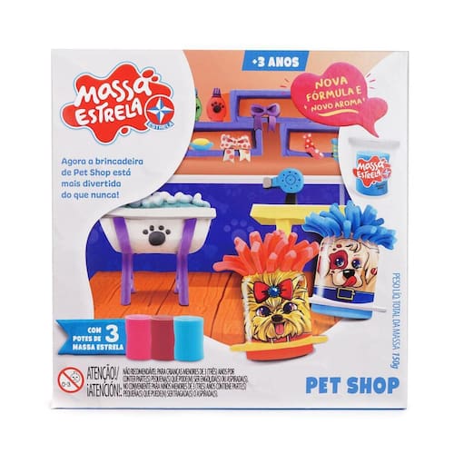 O Pet Shop com Massa Estrela vem com duas extrusoras com adesivos de cachorrinhos, 3 potes de massa de 50g e moldes de acessorios para pets, como bola, osso, pote de ração, lacinho, gravtinha, secador, shampoo e sabonete. Acompanha também rolinho e tesoura para a massa.