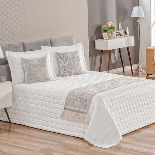 Pezeira King Grécia Caqui Valle Enxovais 5 Peças A Pezeira da Linha Grécia da Valle Enxovais decora a sua cama, e traz sofisticação para o seu quarto. Confeccionada em jacquard, dupla face, com 60% algodão e 40% poliéster. Acabamento com franja.Composição:1 pezeira 2,40m x 0,40m2 capas de almofada 45cm x 45cm2 refis de almofada 45cm x 45cm Tamanho - King