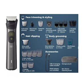 O Philips Norelco Multigroomer é um aparador multifuncional que proporciona a máxima precisão para um cuidado superior do cabelo, rosto e corpo. Desfrute do melhor estilo da categoria com tecnologia BeardAdapt para aumentar a potência exatamente quando você precisa para lidar com barbas densas, espessas ou mais longas. Existem 24 ferramentas e acessórios incluídos para criar uma aparência personalizada. Nosso NOVO pente aparador de precisão oferece 5x mais configurações de comprimento em comparação com nosso antecessor, permitindo mais personalização do que nunca com configurações de comprimento em etapas de 0,2 mm. Também está incluído nosso NOVO protetor Skin Protect, projetado para proporcionar uma aparência limpa e, ao mesmo tempo, proteção extra para a pele. Há também um acessório de barbear corporal para uma limpeza segura e suave. A bateria de íon de lítio rende 2 horas de autonomia, além de um recurso de carga rápida para poder obter um acabamento completo com apenas 5 minutos de carregamento. Este kit tem tudo que você precisa para cuidar de toda a cabeça, rosto e corpo Pente aparador ajustável com configurações de comprimento em etapas de 0,2 mm de 1 a 3 mm A tecnologia BeardAdapt verifica a densidade da barba 125x por segundo Cabo de carregamento USB-A incluído adaptador de energia de parede não incluído 100% à prova de banho Modelo: MG9525/40 dos EUA Marca: Não Informado