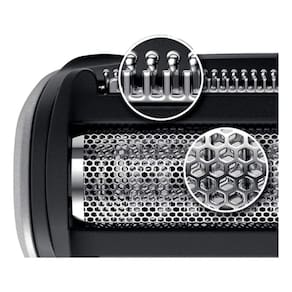 As lâminas têm pontas arredondadas para um contato suave com a pele. Projetada para evitar cortes e cortes, a inovadora cabeça de corte captura pêlos longos, curtos e grossos com uma única passagem.