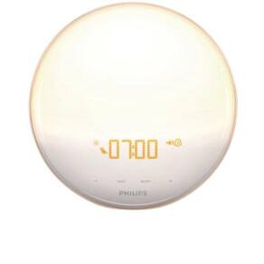Relaxe e adormeça com o pôr-do-sol e sons ofuscantes. O despertador de simulação colorido do amanhecer o desperta gradualmente com uma lâmpada de luz natural e um alto-falante que reproduz uma escolha de 5 sons de despertar calmantes
