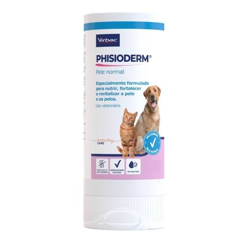 Uso tópico. Após molhar o pelame do animal com água, aplicar a quantidade desejada de Phisioderm shampoo pele normal, espalhando-o por todo o corpo. Massagear o produto uniformemente sobre a pele e os pelos. Deixar que o produto permaneça na pelagem durante 10 minutos e enxaguar em seguida.