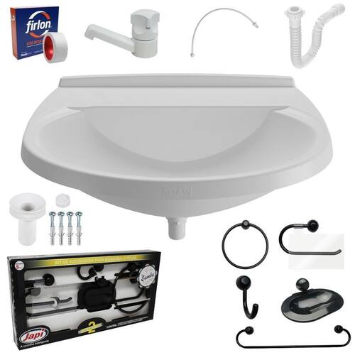 Pia lavatorio banheiro plástico 8l branca astra A pia plástica para banheiro da marca astra é uma opção prática e funcional para instalação em ambientes com espaços reduzidos. Com dimensões compactas e design simples, é fabricada em polipropileno de alta qualidade, o que garante sua resistência e durabilidade. Com capacidade de armazenamento de 8 litros, essa pia é indicada para uso em banheiros e lavabos, sendo uma solução ideal para quem busca uma alternativa econômica e de fácil instalação. Além disso, sua superfície lisa facilita a limpeza e manutenção, permitindo que ela se mantenha higiênica e livre de germes e bactérias. Especificações técnicas Material: polipropileno Dimensões: 35,5 x 28 x 15,8cm Possui porta sabonete: sim Possui furo para torneira: não Capacidade: 8,0l Locais sugeridos: banheiros e lavabos Acabamento: brilhante Marca: astra Cor: preto Formato: oval do fornecedor: 90 dias Kit para banheiro redondo 5 peças preto japi Os acessórios para banheiro são itens essenciais para manter o ambiente organizado, prático e funcional. A papeleira é um suporte para papel higiênico que geralmente é instalado na parede, próximo ao vaso sanitário. O porta toalha argola é um item importante para manter as toalhas sempre à mão e secas. Ele pode ser instalado na parede ou na porta do armário, por exemplo. O porta toalha possui a mesma funcionalidade, e geralmente é fixado na parede, próximo ao chuveiro ou banheira. O cabide simples é um item que serve para pendurar roupas, toalhas e acessórios. Ele pode ser instalado na parede ou na porta do armário, por exemplo. A saboneteira é um item que serve para apoiar o sabonete, mantendo-o seco e evitando que escorregue. Dessa forma, é possível garantir um banheiro organizado e bem equipado, que atenda às necessidades dos usuários. Especificações técnicas Material: poliestireno e alumínio Locais sugeridos: banheiros e lavabos Cor: branco Acabamento: brilhante do fabricante: 5 anos Torneira para lavatório plástica branca japi A torneira para lavatório possui o volante anatômico, que facilita a abertura e o fechamento, o plástico abs com proteção uv, e a durabilidade e a qualidade sempre presente nos produtos da japi. Especificações técnicas Composição: plástico de engenharia abs , polipropileno pp e elastômeros Utilização: água fria Fabricação: nacional Sifão sanfonado universal 61cm branco astra O sifão sanfonado universal astra é um acessório essencial de encanamento, projetado para se adaptar a qualquer saída de válvula de pia e a qualquer tubulação de esgoto, independentemente de seu tamanho ou tipo. Além disso, o sifão sanfonado universal astra corrige possíveis desalinhamentos entre a cuba e a tubulação de despejo, evitando assim a formação de bloqueios e obstruções que possam causar vazamentos ou refluxo de água suja. Esse acessório é ideal para tanques, pias e cubas em banheiros, cozinhas e lavanderias. Especificações técnicas Material: polipropileno Entrada para válvula polegada : 7/8 Saída para tubos e conexões: 38, 40, 48 e 50mm Modelo: para pias, cubas, tanques, lavatórios e válvula americana Suporta temperatura até: 90 graus Cor: branco Acabamento: brilhante do fabricante: 90 dias O kit segue com todos os itens para montagem e pronto para uso após a instalação A se aplica a todo e qualquer vício ou defeito aparente ou que não estejam em conformidade com o produto. - 90 dias para a pia plástica - 90 dias para o sifão - 30 dias para a torneira - 5 anos para o kit de banheiro redondo Itens inclusos 01 pia plástica 01 torneira 01 sifão 01 engates 01 rolo de fita veda rosca 12mm x 5m 01 suporte 01 válvula com tampa 04 buchas s6 04 parafusos 3,5 x 30mm 01 cabide simples 01 saboneteira 01 papeleira 01 porta toalha argola 01 porta toalha 06 buchas s6 06 parafusos 3 x 37mm