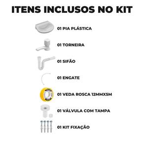 Pia Lavatório Banheiro Plástico 8L Branca A pia plástica para banheiro da marca Astra é uma opção prática e funcional para instalação em ambientes com espaços reduzidos. Com dimensões compactas e design simples, é fabricada em polipropileno de alta qualidade, o que garante sua resistência e durabilidade. ESPECIFICAÇÕES TÉCNICAS Material: Polipropileno Dimensões: 50 x 18,3 x 40cm Possui Porta Sabonete: Sim Possui Furo Para Torneira: Não Capacidade: 8L Locais Sugeridos: Banheiros e Lavabos Acabamento: Brilhante Cor: Branca Formato: Oval do Fabricante: 90 dias Torneira Para Lavatório Plástica Branca A torneira para lavatório possui o volante anatômico, que facilita a abertura e o fechamento, o plástico ABS com proteção UV, e a durabilidade e a qualidade sempre presente nos produtos. ESPECIFICAÇÕES TÉCNICAS Composição: Plástico de engenharia ABS , Polipropileno PP e elastômeros Utilização: Água fria Fabricação: Nacional Sifão Sanfonado Universal 73cm Branco O sifão sanfonado universal é um acessório essencial de encanamento, projetado para se adaptar a qualquer saída de válvula de pia e a qualquer tubulação de esgoto, independentemente de seu tamanho ou tipo. Além disso, o sifão sanfonado corrige possíveis desalinhamentos entre a cuba e a tubulação de despejo, evitando assim a formação de bloqueios e obstruções que possam causar vazamentos ou refluxo de água suja. Esse acessório é ideal para tanques, pias e cubas em banheiros, cozinhas e lavanderias. ESPECIFICAÇÕES TÉCNICAS Material: Polipropileno Entrada Para Válvula Polegada : 7/8 Saída Para Tubos e Conexões: 38, 40, 48 e 50mm Modelo: Para pias, cubas, tanques, lavatórios e válvula americana Suporta temperatura até: 90 graus Cor: Branco Acabamento: Brilhante Manual de Instalação: Sim ITENS INCLUSOS 01 Pia Plástica 01 Suporte 01 Válvula Com tampa 03 Buchas S10 02 Buchas S6 03 Parafusos 3,5 x 55mm 02 Parafusos 3,5 x 30mm 05 Arruelas 01 Torneira Plástica 01 Sifão 01 Rolo de Fita Veda Rosca 12mm x 5m 01 Engate Flexível 40cm x 1/2 Marca: Não Informado Ean: 7894141423667