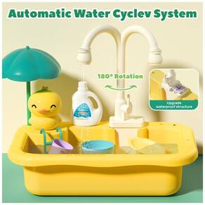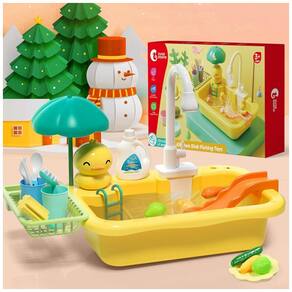 O conjunto de brinquedos de pia 2 em 1 inclui acessórios de brinquedos flutuantes coloridos, permitindo que seus filhos aproveitem o jogo de cozinha enquanto simulam como é a pesca real para desenvolver sua coordenação olho mão. Os brinquedos de pesca e patos de brinquedo também podem ser utilizados como brinquedos de banho e piscina. Os brinquedos de dramatização de cozinha incluem copo de plástico, prato de plástico, escova, detergente para brincar, conjunto de garfo e faca de plástico e brinquedos de comida para as crianças brincarem.