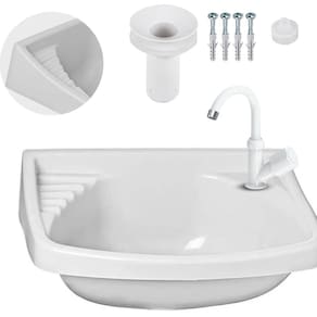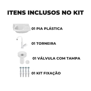 ITENS INCLUSOS 01 Pia Plástica 01 Suporte 01 Válvula Com tampa 04 Buchas S8 02 Buchas S6 04 Parafusos 3,5 x 38mm 02 Parafusos 3,5 x 30mm 06 Arruelas 01 Torneira Plástica Marca: Não Informado