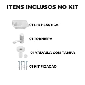 ITENS INCLUSOS 01 Pia Plástica 01 Torneira Plástica 01 Suporte 01 Válvula Com tampa 04 Buchas S8 02 Buchas S6 04 Parafusos 3,5 x 38mm 02 Parafusos 3,5 x 30mm 06 Arruelas Marca: Não Informado Ean: 7894141423643
