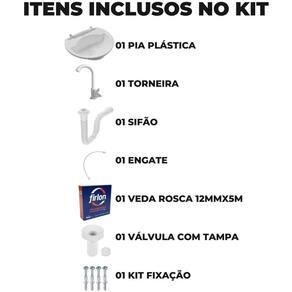 Pia lavatório banheiro 4l + torneira branca + sifão universal sanfonado + engate flexível + fita veda rosca Pia lavatorio banheiro plástico 4l branca astra A pia plástica para banheiro da marca astra é uma opção prática e funcional para instalação em ambientes com espaços reduzidos. Com dimensões compactas e design simples, é fabricada em polipropileno de alta qualidade, o que garante sua resistência e durabilidade. Com capacidade de armazenamento de 4 litros, essa pia é indicada para uso em banheiros e lavabos, sendo uma solução ideal para quem busca uma alternativa econômica e de fácil instalação. Além disso, sua superfície lisa facilita a limpeza e manutenção, permitindo que ela se mantenha higiênica e livre de germes e bactérias. Especificações técnicas Material: polipropileno Dimensões: 35,5 x 28 x 15,8cm Possui porta sabonete: sim Possui furo para torneira: não Capacidade: 4,0l Locais sugeridos: banheiros e lavabos Acabamento: brilhante Marca: astra Cor: branca Formato: oval do fabricante: 90 dias Torneira para lavatório plástica branca japi Especificações técnicas Composição: plástico de engenharia abs , polipropileno pp e elastômeros Utilização: água fria Fabricação: nacional Sifão sanfonado universal 61cm branco astra O sifão sanfonado universal astra é um acessório essencial de encanamento, projetado para se adaptar a qualquer saída de válvula de pia e a qualquer tubulação de esgoto, independentemente de seu tamanho ou tipo. Além disso, o sifão sanfonado universal astra corrige possíveis desalinhamentos entre a cuba e a tubulação de despejo, evitando assim a formação de bloqueios e obstruções que possam causar vazamentos ou refluxo de água suja. Especificações técnicas Material: polipropileno Entrada para válvula polegada : 7/8 Saída para tubos e conexões: 38, 40, 48 e 50mm Modelo: para pias, cubas, tanques, lavatórios e válvula americana Suporta temperatura até: 90 graus Cor: branco Acabamento: brilhante do fabricante: 90 dias Engate mangueira flexível para descarga 40cm x 1/2 branco astra Um engate flexível para descarga é um dispositivo para conectar um cano de esgoto ou uma mangueira de descarga a uma fonte de escoamento, como uma pia, banheira ou vaso sanitário. Ele é projetado para ser flexível, permitindo que ele se dobre e se mova sem quebrar ou vazar. Especificações técnicas Material: pvc flexível Temperatura indicada: somente água fria Pressão: 40 m.C.A Diâmetro: 1/2 Tipo de corpo: macho-fêmea e fêmea-fêmea Cor: branco Acabamento: brilhante do fabricante: 90 dias O kit segue com todos os itens para montagem e pronto para uso após a instalação A se aplica a todo e qualquer vício ou defeito aparente ou que não estejam em conformidade com o produto. - 90 dias para a pia plástica - 30 dias para a torneira - 90 dias para o sifão - 90 dias para o engate Itens inclusos 01 pia plástica 01 torneira 01 sifão 01 engate 01 rolo de fita veda rosca 12mm x 5m 01 suporte 01 válvula com tampa 04 buchas s8 02 parafusos 3,5 x 30mm 06 arruelas