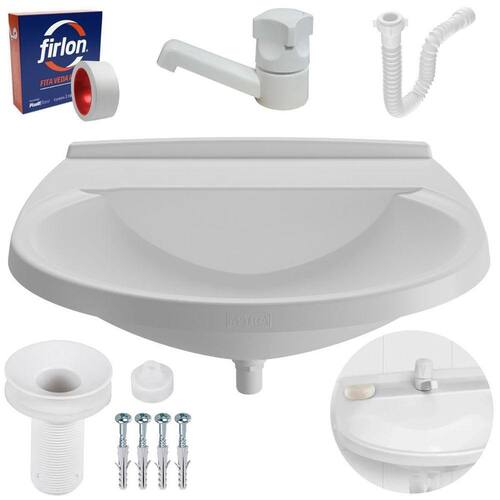 Pia lavatório banheiro 8l + torneira branca + sifão universal sanfonado + fita veda rosca