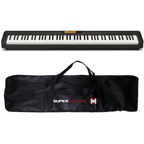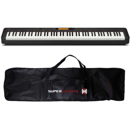 ESSA EMBALAGEM CONTÊM: 1X - Piano Digital Casio CDP-S360 Preto - 88 Teclas1X - Pedal (SP-3)1X - Estante para partitura1X - Adaptador CA (AD-A12150LW)1X - Capa de Piano CARACTERÍSTICAS PRINCIPAIS: - Trata-se de um Piano Digital sempre à mão, e pronto para ser tocado! A linha CDP-S da Casio é muito conhecida por ser compacta, simples uso, sonoridade forte, conforto e estrutura simples, mas muito elegante!- Desenvolvido diante de muitas novas tecnologias, o CDP-S160 traz mecanismos que oferecem o toque tátil de um piano, compatibilidade com suportes que complementam sua experiência com o instrumento, funcionalidade de uso intuitivo, Modo Dueto que permite o uso de 2 músicos no mesmo instrumento simultaneamente, e muito mais!- Venha conferir essa grande novidade! A Super Sonora traz para você mais uma novidade IMPERDÍVEL! o CDP-S360 da CASIO. Modelo de Piano Digital com Funcionalidades Impressionantes e Inovadoras, que ao Mesmo Tempo Traz Elegância e Simplicidade pelo seu Design Refinado! Vem pra Super Sonora! DADOS TÉCNICOS: Teclado:- Número de teclas: 88- Ações das teclas: Scaled Hammer Action Keyboard ?- Resposta ao toque: 3 níveis de sensibilidade, desligado Timbres:- Polifonia (máxima): 128- Número de tons integrados: 700- Camada: Sim- Tempo intermediário: Sim Efeitos digitais: - Simulador de hall de modo de som/Reverberação: Reverberação 10- Chorus: 4- DSP: Sim (predefinido para alguns tons) Ritmos de acompanhamento: - Número de ritmos integrados: 200- Toque predefinido: 200- Ritmos do usuário: 10 Músicas Biblioteca de música: - 152 músicas, incluindo 50 frases para exercícios- Função de lições: Parte LIGA/DESLIGA- Seleção da parte da função de lições: Mão direita, mão esquerda, ambas as mãos- Música de demonstração: 1- Expansão de músicas (músicas do usuário): 10 Recursos adicionais: - Conexão com o aplicativo: Chordana Play for Piano ver.2.4- Bluetooth: Opcional: MIDI sem fio e adaptador de áudio (WU-BT10) Bluetooth Versão 5.0- Áudio Bluetooth: Perfil: A2DP, Codec: SBC- MIDI Bluetooth: Perfil: GATT (MIDI via Bluetooth ® de baixa energia)- Gravador/Reprodução MIDI: 6 faixas (1 faixa do sistema + 5 faixas), 5 músicas- Capacidade de dados de reprodução/gravador MIDI: Aproximadamente 12.000 notas- Modo Dueto: Sim- Mudança de oitava: De -2 oitavas a 0 a +2 oitavas- Metrônomo: 0 a 9 batidas; intervalo de tempo: 20 a 255- Pedais: Incluso: SP-3, unidade opcional de 3 pedais: SP-34, CS-470P (abafador, suave, sustenido)- Meio pedal abafador dos pedais: Sim (unidade opcional de 3 pedais)- Transposição de teclas: De -12 semitons a 0 a +12 semitons- Controle de afinação: A4 = 415,5 Hz a 440,0 Hz a 465,9 Hz- Afinação de escala (temperamento): Temperamento igual + 16 variações- Roda de altura de tons: Sim- Trava de operação: Sim- Outros: Botão Categoria, Registro: 32 configurações (4 conjuntos x 8 bancos), Predefinição de música: 310, Harmonização automática: 12 tipos, Arpejador: 100 tipos, Desligamento automático Resolução: - LCD com fundo luminoso MIDI:- Sim (compatível com GM nível 1) Conectividade e armazenamento: - FONES/SAÍDA: 1 (miniconector estéreo) terminal de SAÍDA multiuso- Pedais: 1 (Abafador/Atribuição)- Conector para unidade de 3 pedais: Sim (SP-34, CS-470P)- ENTRADA DE ÁUDIO: Sim- USB tipo A: Sim (MIDI e adaptador de áudio sem fio) USB Tipo B: Sim Alto-falantes e amplificadores: - Tamanho dos alto-falantes: [13 cm x 7 cm(oval)] × 2- Sistema de alto-falantes: 2 alto-falantes- Amplificadores: 8W + 8W Alimentação: - Adaptador CA: AD-A12150LW- Unidade de bateria: 6 pilhas tamanho AA- Duração da bateria em uso contínuo: Aproximadamente 4 horas Dimensões:- 1.322 x 232 x 99 mm Peso:- 10,5 kg Acessórios incluídos: - Pedal (SP-3)- Estante para partitura- Adaptador CA, (AD-A12150LW)
