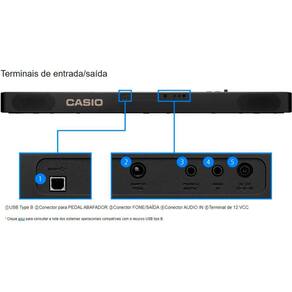 Conectividade e armazenamento: FONES/SAÍDA: 1 (miniconector estéreo) terminal de SAÍDA multiuso Pedais: 1 (abafador) AUDIO IN: Sim USB tipo B: Sim
