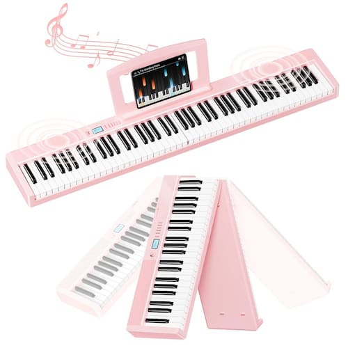 - [Piano dobrável]: o design de forma dobrável recentemente atualizado é utilizado, e uma dobradiça mecânica mais refinada e estável é criada por artesanato requintado, que é forte e firme, se encaixa perfeitamente, pode ser aberta e fechada a 180 graus de forma flexível. O tamanho do teclado do piano após dobrar é de apenas 61,5 x 21,6 x 13 cm. É mais conveniente de carregar e mais livre para jogar