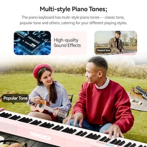 - [Conexão multifuncional]: o teclado de piano dobrável TERENCE está equipado com funções convenientes, como MIDI, entrada de áudio, entrada de fone de ouvido, microfone, pedal e conector de alimentação. O módulo Bluetooth integrado permite que você conecte seu celular, computador ou tablet, conecte-se a alguns aplicativos de ensino de piano e aprenda cursos de música online. Para que você possa se divertir aprendendo e praticando piano