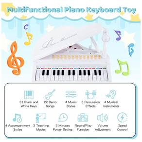 Teclado de piano multifuncional: Este brinquedo de teclado de piano multifuncional possui 31 teclas pretas e brancas, 22 músicas de demonstração, 4 estilos musicais, 8 efeitos de percussão, 4 instrumentos musicais, 4 estilos de acompanhamento, função de gravação, reprodução, ajuste de volume e controle de velocidade. Assim, criará diversão sem fim para os mais pequenos.