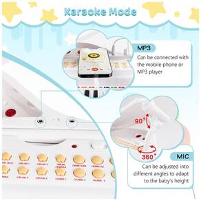 Modo Karaokê com cabo USB: O microfone permite que as crianças pratiquem canto enquanto tocam piano. A interface MP3 pode ser conectada ao celular, iPad, computador ou MP3 player. Enquanto isso, a interface MIC se conecta ao micrófago que pode ser ajustado em diferentes ângulos para se adaptar à altura do bebê.