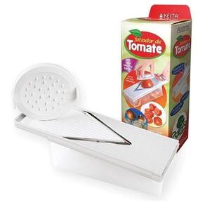 Fatiador de Tomates e legumes, fatia com facilidade tomates, cebola, pimentão e outros legumes. O fatiador de tomates possui ajuste para 2 espessuras diferentes, protetor e recipiente onde os legumes cortados ficam, além de dar maior apoio na hora do corte.
