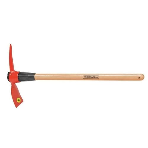 Descrição A picareta é forjada em todo o corpo da peça, proporcionando maior resistência e menor desgaste durante o uso. Fabricada em aço carbono especial forjado de alta qualidade. Recebe pintura eletrostática a pó, que tem uma melhor apresentação visual e maior proteção contra oxidação. Lâmina com tamanho 4.Possui olho oval de 70 x 45 mm.O cabo de 90 cm desta ferramenta, além de possuir ótima resistência, é produzido com madeira de origem renovável com acabamento envernizado, para um melhor acabamento e apresentação do produto. A camada protetora em verniz incolor realça sua tonalidade, concedendo brilho e um toque mais liso ao produto. O sistema de encabamento com bucha plástica proporciona excelente fixação da picareta, evitando que os cabos se soltem durante o uso. A bucha absorve a contração da madeira, mantendo o cabo sempre firme, e auxilia na absorção do impacto durante o uso. Com suas robustas extremidades, as picaretas são ferramentas para cavar terrenos bastante compactados, quebrar e arrancar pedras. São utilizadas na agricultura, jardinagem e construção civil. A pá larga é utilizada na capina, revolvimento do solo e corte de algumas raízes e a ponta também permite que o usuário possa quebrar eventuais rochas.