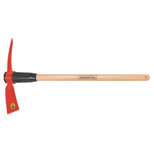 Para trabalhos com superfícies duras, a Picareta Alvião Tramontina em Aço Tamanho 5 com Cabo de Madeira 90 cm é a ferramenta certa. Projetada para cavar, quebrar ou arrancar pedras ou asfalto, ela é produzida em aço carbono forjado, material que garante alta qualidade e resistência. Recebe ainda pintura eletrostática a pó que protege contra oxidação, além de trazer cabo de 90 centímetros em madeira envernizada. Assegurando mais conforto e firmeza, o cabo possui sistema de encabamento com bucha plástica, que absorve melhor o impacto e evita que o cabo se solte no uso. É uma ferramenta com lâmina de tamanho 5 e olho oval de 70x45 mm. Uma peça essencial para o sucesso do seu trabalho. - A picareta é forjada em todo o corpo da peça, proporcionando maior resistência e menor desgaste durante o uso.- Fabricada em aço carbono especial forjado de alta qualidade.- Recebe pintura eletrostática a pó, que tem uma melhor apresentação visual e maior proteção contra oxidação.- Lâmina com tamanho 5.- Possui olho oval de 70 x 45 mm.- O cabo de 90 cm desta ferramenta, além de possuir ótima resistência, é produzido com madeira de origem renovável.- Cabo com acabamento envernizado, para um melhor acabamento e apresentação do produto. A camada protetora em verniz incolor realça sua tonalidade, concedendo brilho e um toque mais liso ao produto.- O sistema de encabamento com bucha plástica proporciona excelente fixação da picareta, evitando que os cabos se soltem durante o uso. A bucha absorve a contração da madeira, mantendo o cabo sempre firme, e auxilia na absorção do impacto durante o uso. Observações - Com suas robustas extremidades, as picaretas são ferramentas para cavar terrenos bastante compactados, quebrar e arrancar pedras. São utilizadas na agricultura, jardinagem e construção civil. - A pá larga é utilizada na capina, revolvimento do solo e corte de algumas raízes e a ponta também permite que o usuário possa quebrar eventuais rochas.- Para descarte dos produtos e embalagens siga as orientações de reciclagem vigentes. Características Gerais EAN13 7891117012689 DUN14 17891117012686 NCM 8201.30.00 Peso Líquido 2,9910 kg. Peso Bruto 2,9970 kg. Metragem 0,009967 m³. Dimensões Embalagem (Compr. X Larg. X Alt.) 905x 505x 104 mm. Dimensões Produto (Compr. X Larg. X Alt.) 905x 104x 497 mm. Cor 1 FF0000 Hexa