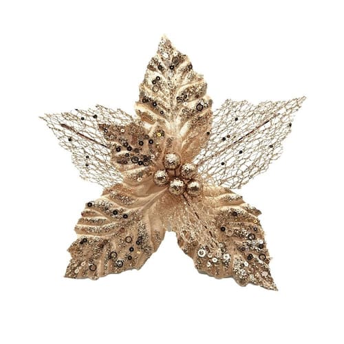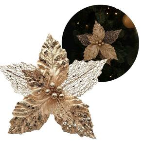 Leve sofisticação e brilho à sua decoração natalina com este pick decorativo de flor bico de papagaio, produzido em veludo champanhe com acabamento vazado, realçado por glitter e lantejoulas que proporcionam luminosidade e elegância.