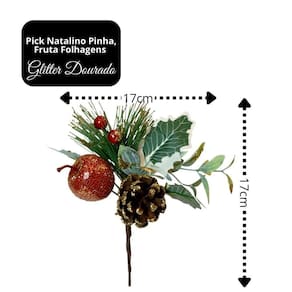 Leve mais brilho e sofisticação para sua decoração natalina com este pick decorativo de folhagem, pinha e fruta com glitter dourado!
