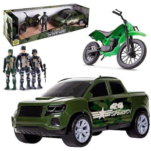 Carro pick-up roda livre force warfare com boneco + moto na caixaCódigo1228306Informações adicionais:Produto certificado: ce- bri/brics 00275-16Ean: 7898631556002Validade: indeterminadaIndicação: maiores de 3 anosTamanho aproximado da caixa: a:11,5xl:45xp:11cmPeso aproximado: 280gTipo de produto: carro pick-up roda livre force warfare com boneco + moto na caixaCor: coloridoComposição: plastico Marca: Diverpast