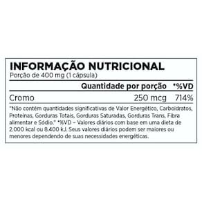 Benefícios: - Contribui para a perda de peso e gordura; - Auxilia no controle do apetite; - Ajuda no crescimento muscular; - Livre de Glúten; - 250 mcg Cromo por dose.