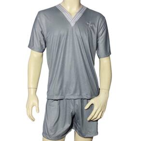 Pijama masculino em malha lisa, com detalhe em malha com estampa variada no decote v, bordado, manga curta. Short com elástico no cós com acabamento e bainha.