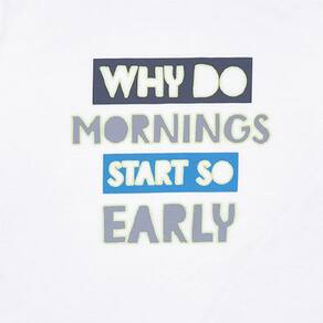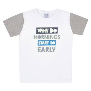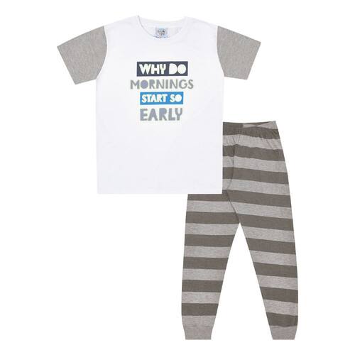 Para as noites mais fresquinhas de verão, aposte no nosso pijama baby listrado! Confeccionado em tecido meia malha, a camiseta na cor branca possuí as mangas na cor cinza e estampa com escrita “why do mornings start so early” (por que as manhãs começam tão cedo) e para deixar a peça ainda mais divertida a frase brilha no escuro. A calça possuí estampa rotativa com listras horizontais na cor cinza.\n