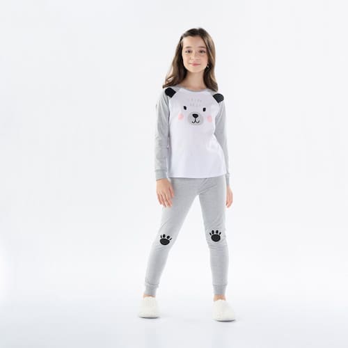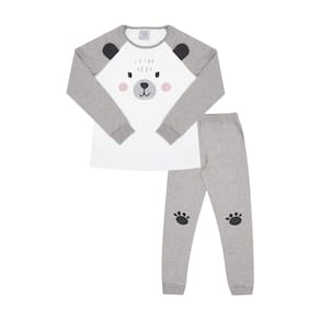 Nosso conjunto de pijama é composto pela blusa e a calça em tecidos meia malha na cor branco com mescla cinza. A blusa de manga longa possuí estampa frontal de ursinho com orelhas interativas e a calça com elastano na cintura também possuí estampa de patinhas de urso no joelho. Assim a hora do soninho se torna mais leve, quentinha e alegre!\n