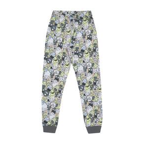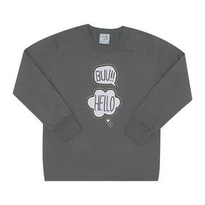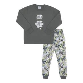 Quentinho e divertido para aquecer os pequenos durante a estação. Confeccionado em moletinho, o blusão de manga longa na cor carbono possuí estampa frontal com escrita "buu!" "Hello" e ambas brilham no escuro também. Já a calça possuí estampa rotativa na cor pistache de pequenos fantasmas e seres divertidos além de possuir elastano no cós. Tudo para garantir uma boa noite de sono aos pequenos aventureiros!\n