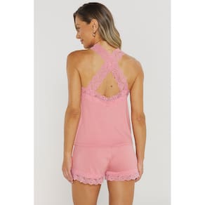Pijama feminino com detalhes em renda nas alças, cavas e decote, com destaque para o formato “X” nas costas e abertura em gota na parte frontal. O shorts possui cós rebatido e renda sobreposta na barra. Confeccionado em viscolycra (95% viscose e 5% elastano), oferece suavidade, conforto e elegância para suas noites.