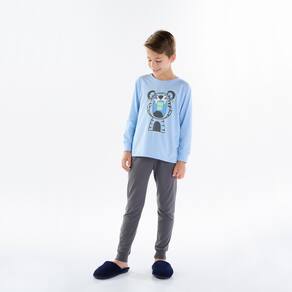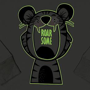 Pijama manga longo confeccionado em meia malha para os pequenos aventureiros. A camiseta na corhortênsia possuí estampa divertida de tigre bocejando com escrita "Rugido curto" e o detalhe esta na estampa que brilha no escuro. A calça na cor carbono possuí elastano na cintura para maior conforto na hora do sono. O pijama favorito dos pequeninos para a estação!\n