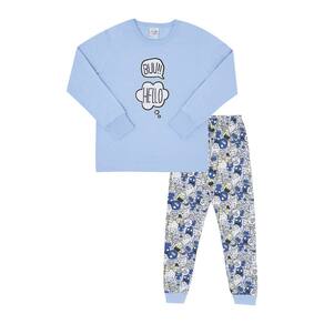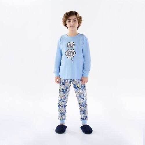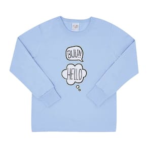 Quentinho e divertido para aquecer os meninos durante a estação. Confeccionado em moletinho, o blusão de manga longa na cor hortênsia possuí estampa frontal com escrita "buu!" "Hello" e ambas brilham no escuro também. Já a calça possuí estampa rotativa na cor hortênsia de pequenos fantasmas e seres divertidos além de possuir elastano no cós. \n