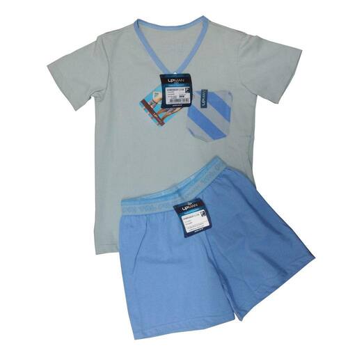 Pijama infantil masculino Upman Curto Manga Curta com bolso frontal do lado esquerdo na altura do peito e na costas escrito "Tal Pai", e shorts listrado.